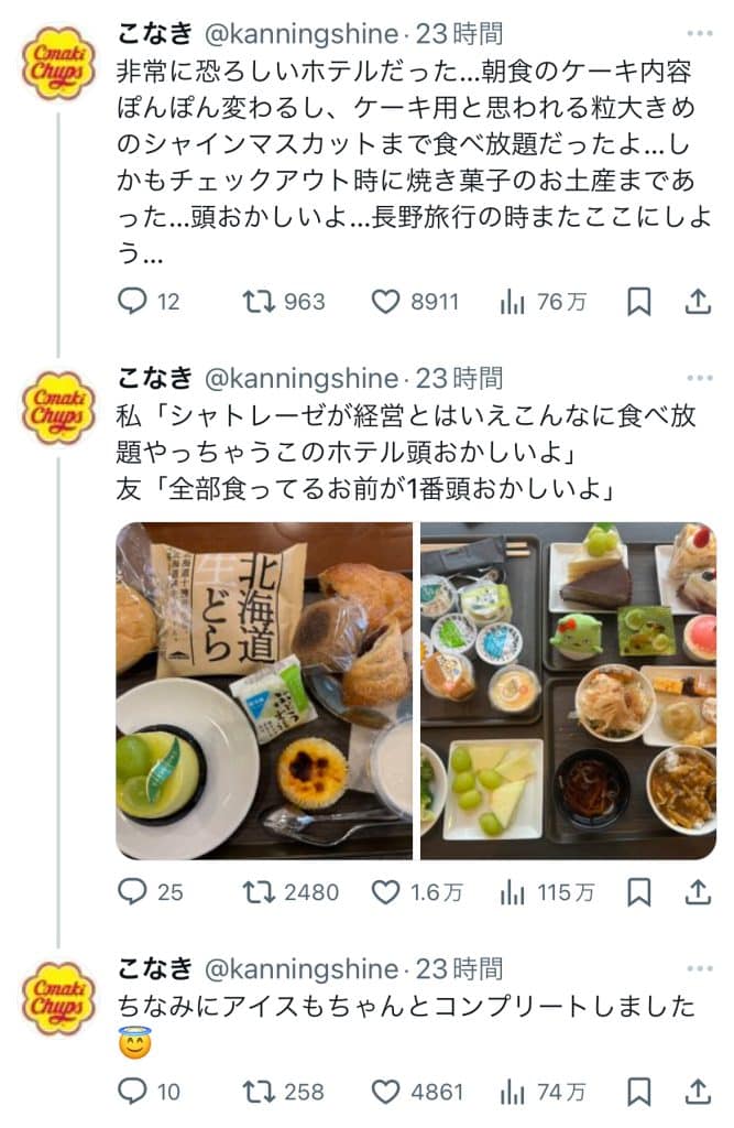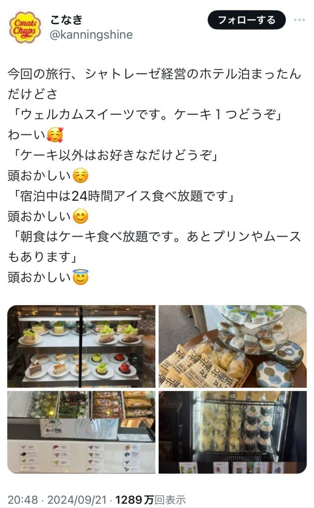 夢のホテル発見!!! 2024 10/19 おもしろ 2024年10月19日これケーキ以外全部食べ放題だって!朝食はケーキ食べ放題!!朝からケーキがたくさん食べられるだなんてぇぇぇぇぇぇ!! あわせて読みたい シャトレーゼホテル 長野【公式】 | CHÂTERAISÉ HOTEL Nagano【Official site】 シャトレーゼホテル 長野の施設案内をご紹介します。行ってみたい!!たくさん食べたい!! おもしろ よかったらシェアしてね! URLをコピーしました! URLをコピーしました! イマドキな感覚ってどのくらい持ってる? 美味しいモンブランが食べたい この記事を書いた人 Yurika 毎日面白いこと常に探してます! みんなの毎日に花が咲けばいいな☆関連記事 何争い!? 2024年10月21日 先入観でものをみる・・・ 2024年10月21日 美味しいモンブランが食べたい 2024年10月19日 イマドキな感覚ってどのくらい持ってる? 2024年10月19日 こんな答えしたことある? 2024年10月19日 女の子の本音 2024年9月30日 宿題終わった? 2024年9月18日 コメント コメントする コメントをキャンセルコメント ※名前 ※ メール ※ サイト 次回のコメントで使用するためブラウザーに自分の名前、メールアドレス、サイトを保存する。 Δ